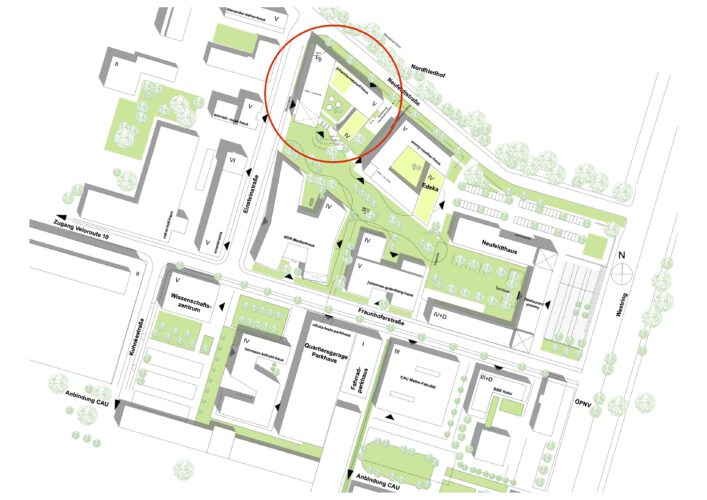 Der neu angelegte Campuspark bildet die Fortsetzung als Grünachse aus dem Schlosspark Richtung Norden und schafft neue Aufenthaltsmöglichkeiten zur aktiven Pausengestaltung für Mitarbeiter und Besucher des Kreishauses und der Klinik.