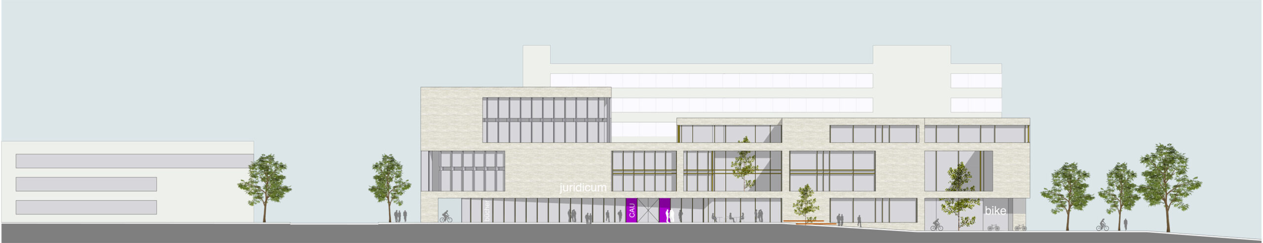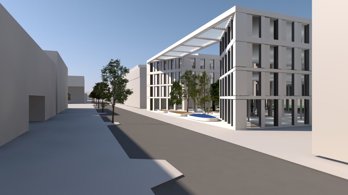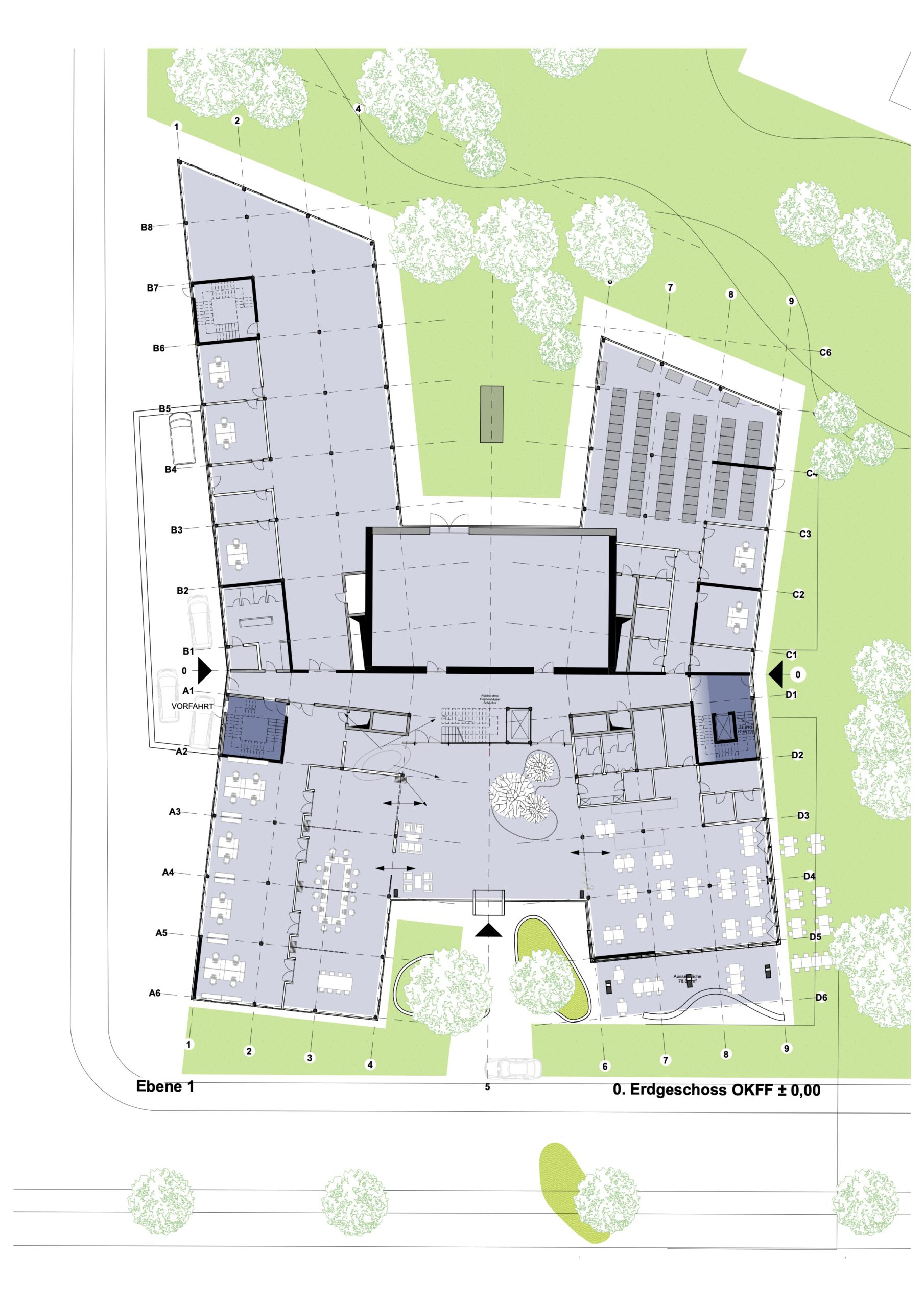 Das Gebäude weicht zum Erhalt der großen Bäume im Kreuzungsbereich Ferdinand-Tönnies-Straße / Marktstraße zurück und engt hierdurch den Straßenraum nicht zu sehr ein. Zur Parkseite kragen die beiden oberen Ebenen des 5-geschossigen Bauteils aus, um die Grünfläche in möglichst großer Breite offen zu halten. Der Freiraum vor dem Kreishaus an der Marktstraße wird durch den Erweiterungsbau neu gefasst und wird stärker als Platz erlebbar.