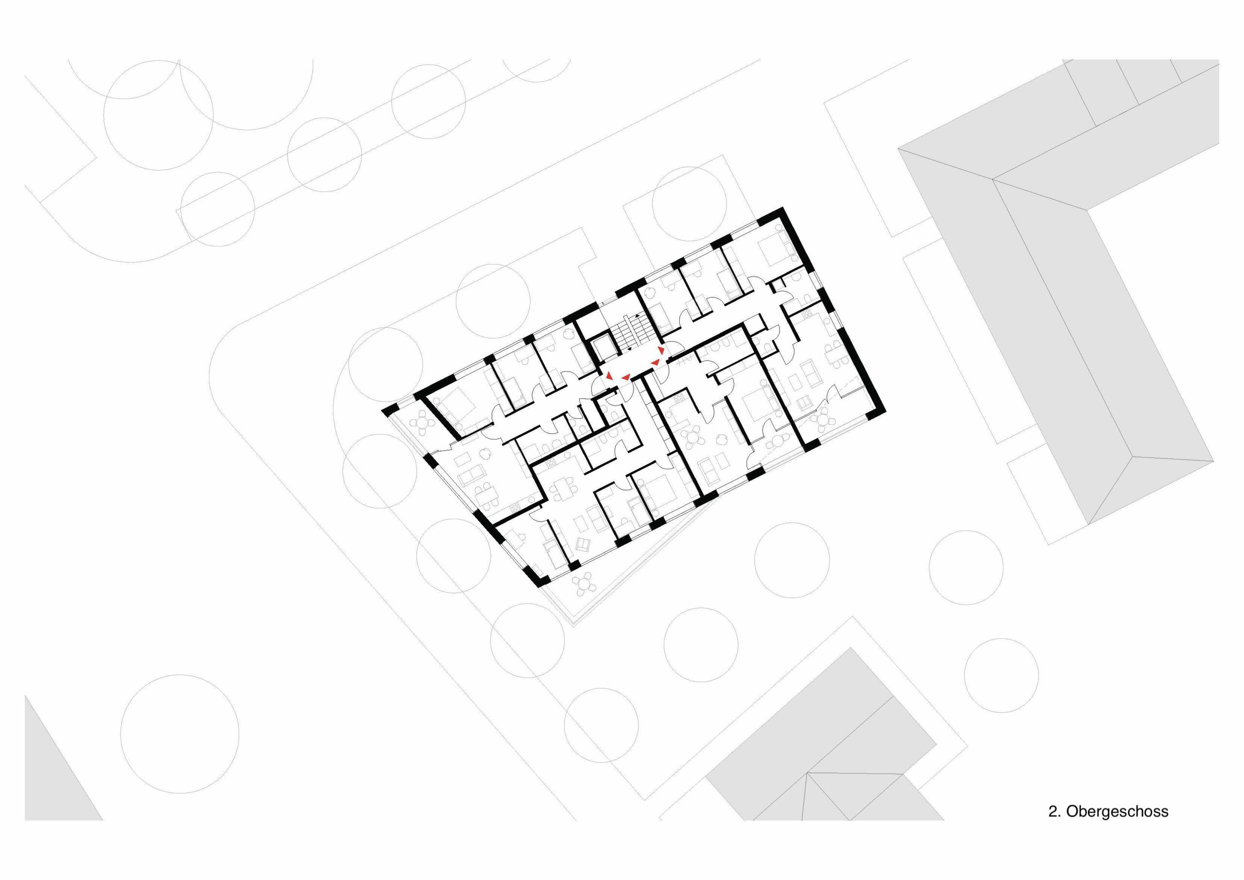 Das Motiv der mit Hecken und Bäumen umsäumten Vorgärten wird fortgeführt.Im südlichen Bereich ist ein Gemeinschaftsgarten geplant, der vor allem jungen Familien einen geschützten Aufenthalts- und Spielraum bietet. Der Baukörper weicht gegenüber dem südlichen Nachbarn zurück, um die Besonnung zu verbessern und dem Bestand genügend Raum zu lassen.