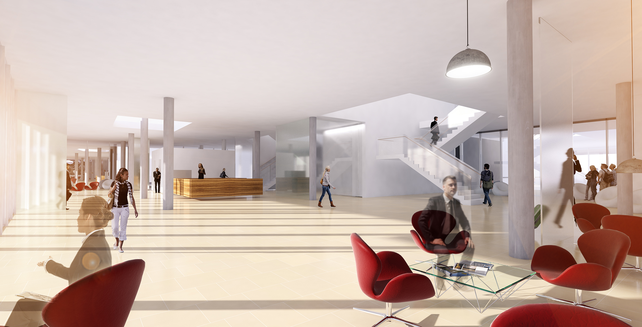 Die expressive Auskragung zum Vorplatz führt den Außenraum in das Gebäude hinein. Es öffnet sich. Lädt ein und bildet mit der Abfolge von Vorplatz, Foyer und öffentlichen Erdgeschossnutzungen eine räumliche Einheit.