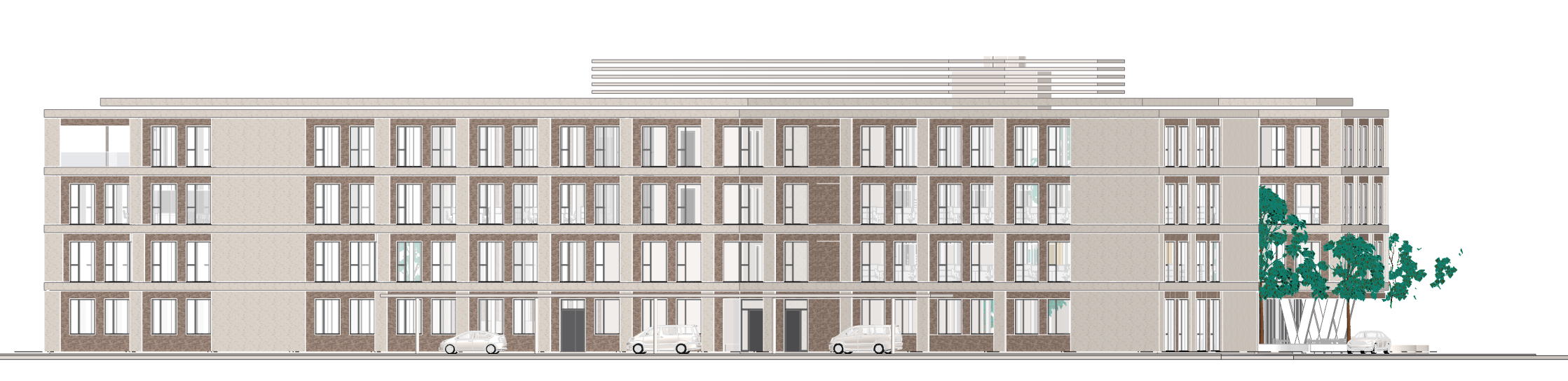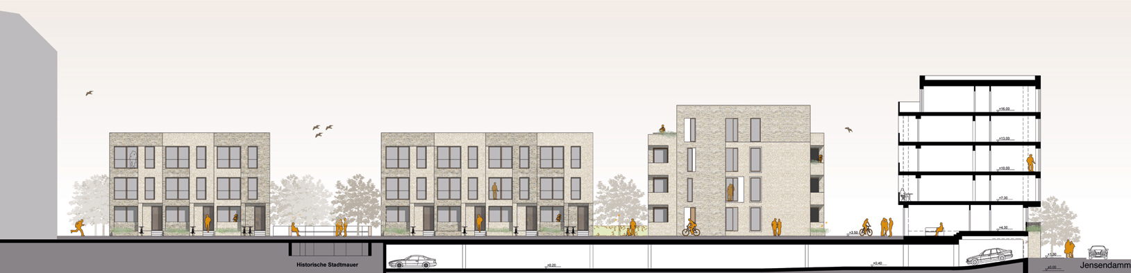 Die Gebäude entlang der Elefantenstraße, Tulipan- und Untereiderstraße werden als Mehrfamilienhäuser mit 2 Vollgeschossen und ausgebautem Dachgeschoss auf einem zusammenhängenden Kellergeschoss mit Tiefgarage errichtet.