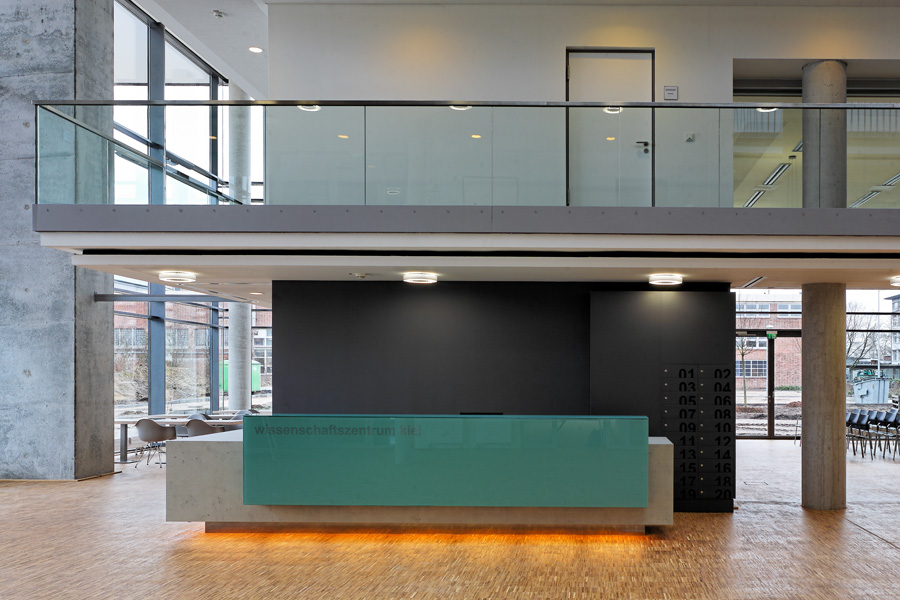 Unmittelbar am Haupteingang liegt der zentrale Empfangs- und Infobereich als Verteiler in die angeschlossenen Fachabteilungen. Die über das Glasdach natürlich belichtete Eingangshalle des Sozialzentrums mit dem Empfangsbereich im Erdgeschoss erstreckt sich über drei Geschosse, bietet eine leichte Orientierung und übersichtliche Wegeführung durch die freien Treppen auf die Galerien der angeschlossenen Obergeschosse.