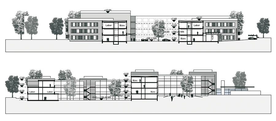 Die Laborhallen nehmen die lineare Struktur der ehemaligen Schiffbauhallen im Stadtteil Dietrichsdorf auf, docken mit einer Brücke an bestehende, umgenutzte Altbauten an und binden das Gebäude der alten Metallgießerei in das Ensemble ein. Leichte Stahlrahmenkonstruktionen mit bogenförmigen Dächern und Glasfassaden sollen Einblicke in die Arbeit des Fachbereichs Maschinenbau mit Kolben- und Strömungsmaschinen, Fahrzeugtechnik und Strömungstechnik, sowie der Elektrotechnik mit Hochspannungs-, Stossstrom- und Labor für elektromagnetische Verträglichkeit vermitteln.