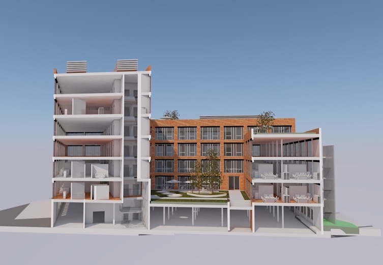 Dies ist der neue Zentralbereich mit der Anbindung an den Bestand, der Versorgung der Bewohner und der vertikalen Erschließung der anschließenden Wohnebenen.