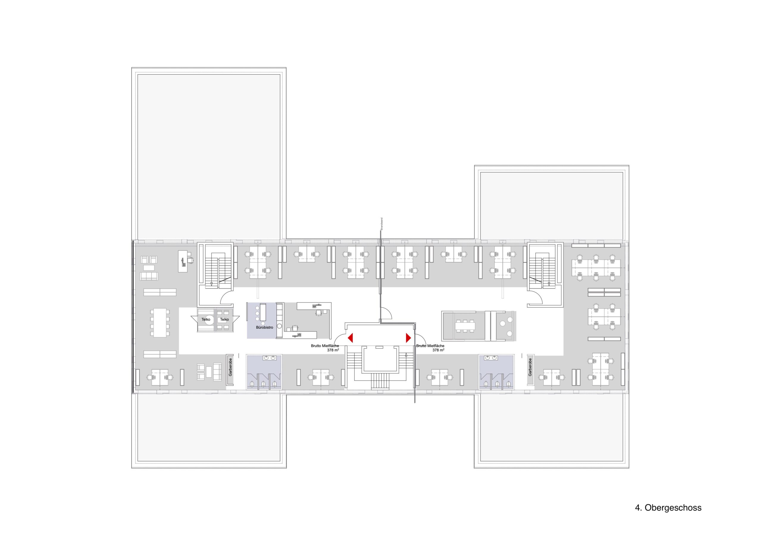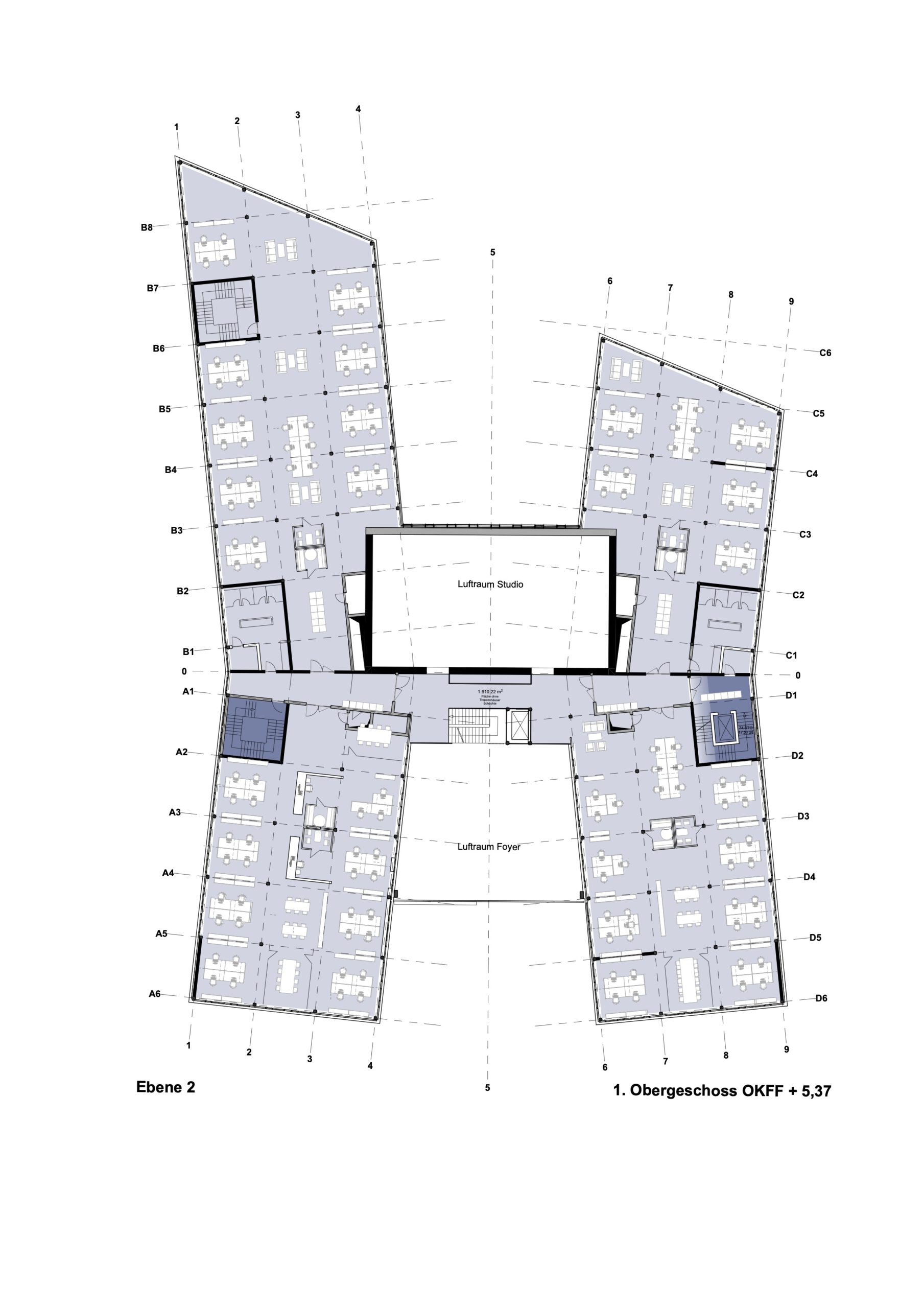 Die Großzügigkeit setzt sich im Inneren über die Galerien der Obergeschosse fort und findet in den streng geordneten Geschossen im 3. Und 4. Obergeschoss ihren Abschluss. Der Baukörper leitet sich in seiner Form direkt aus den Funktionen und der Zonierung des Gebäudes ab.