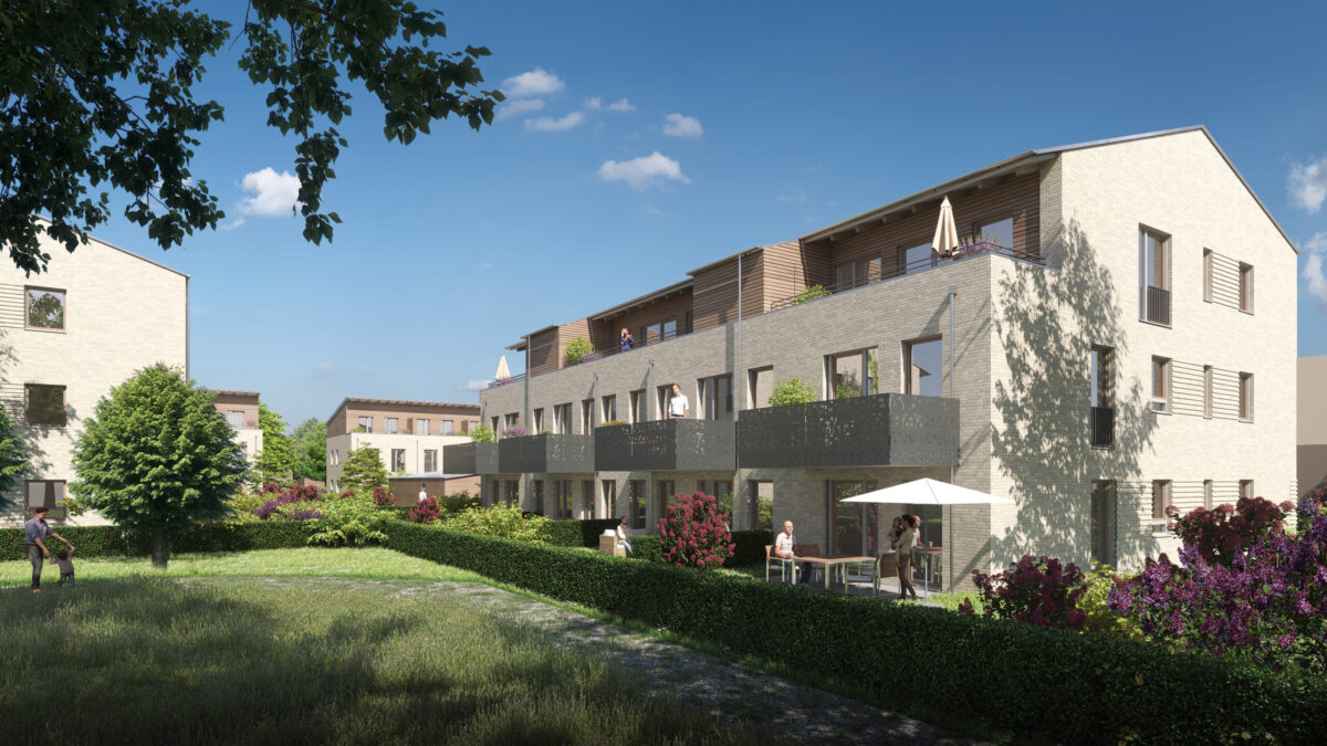An der Arsenalstraße entstehen 5 giebelständige Stadthäuser für Familien, deren KFZ ebenfalls in der Tiefgarage untergebracht werden.