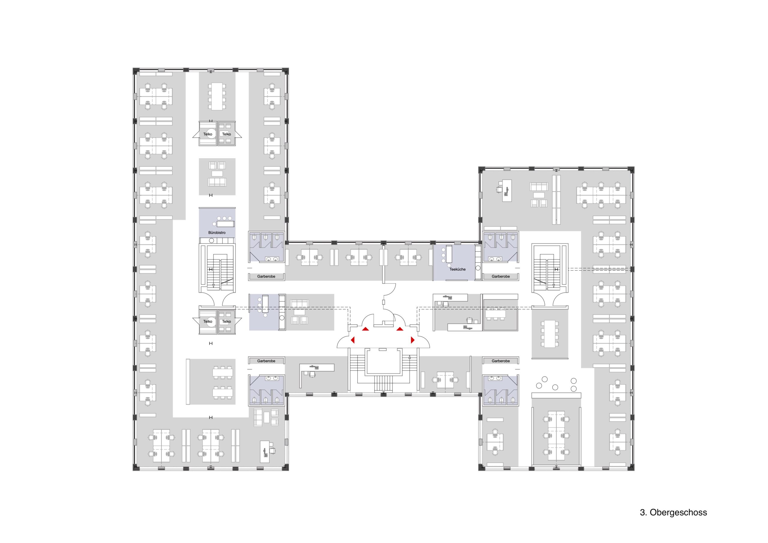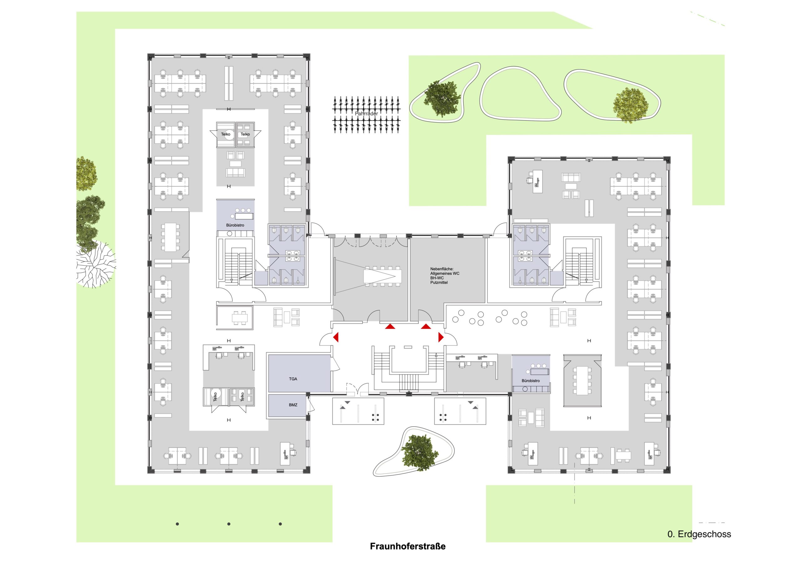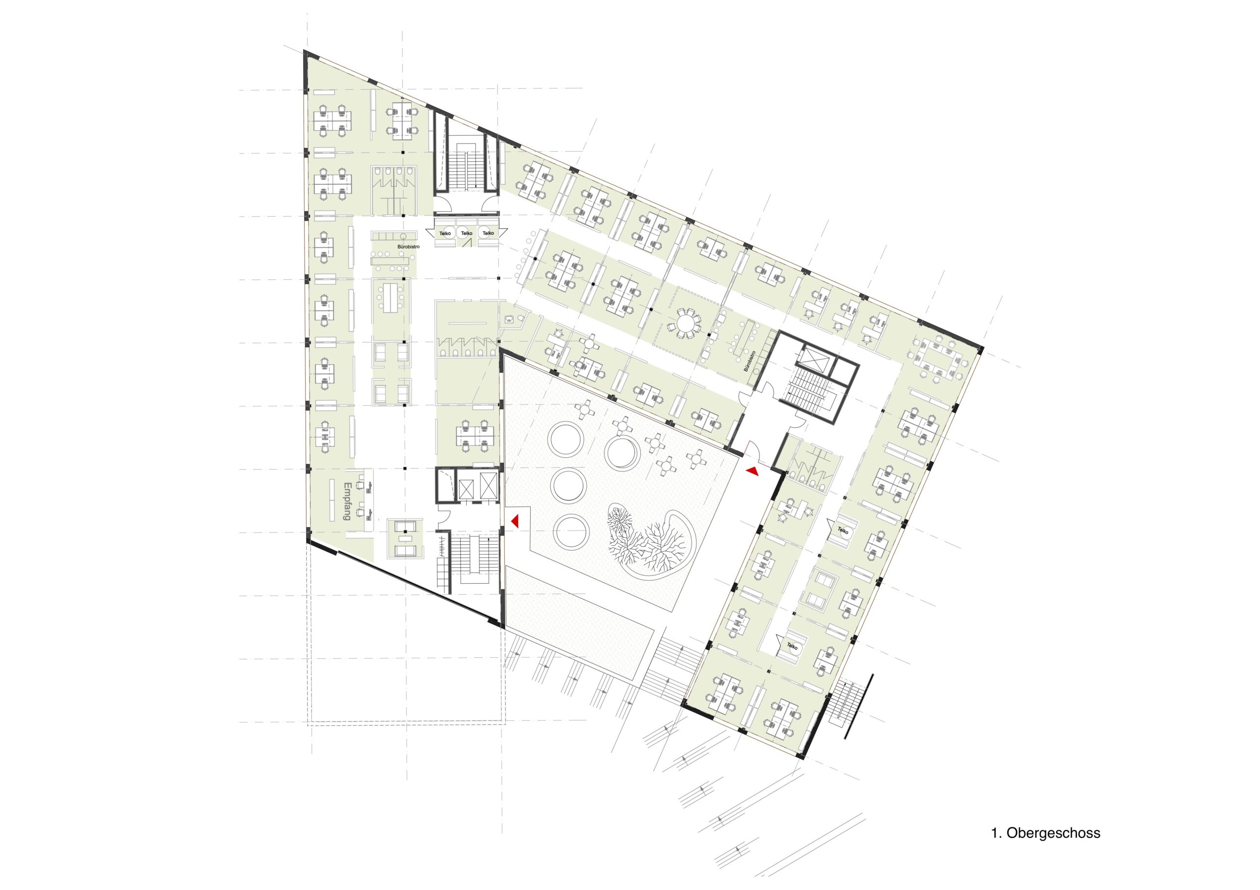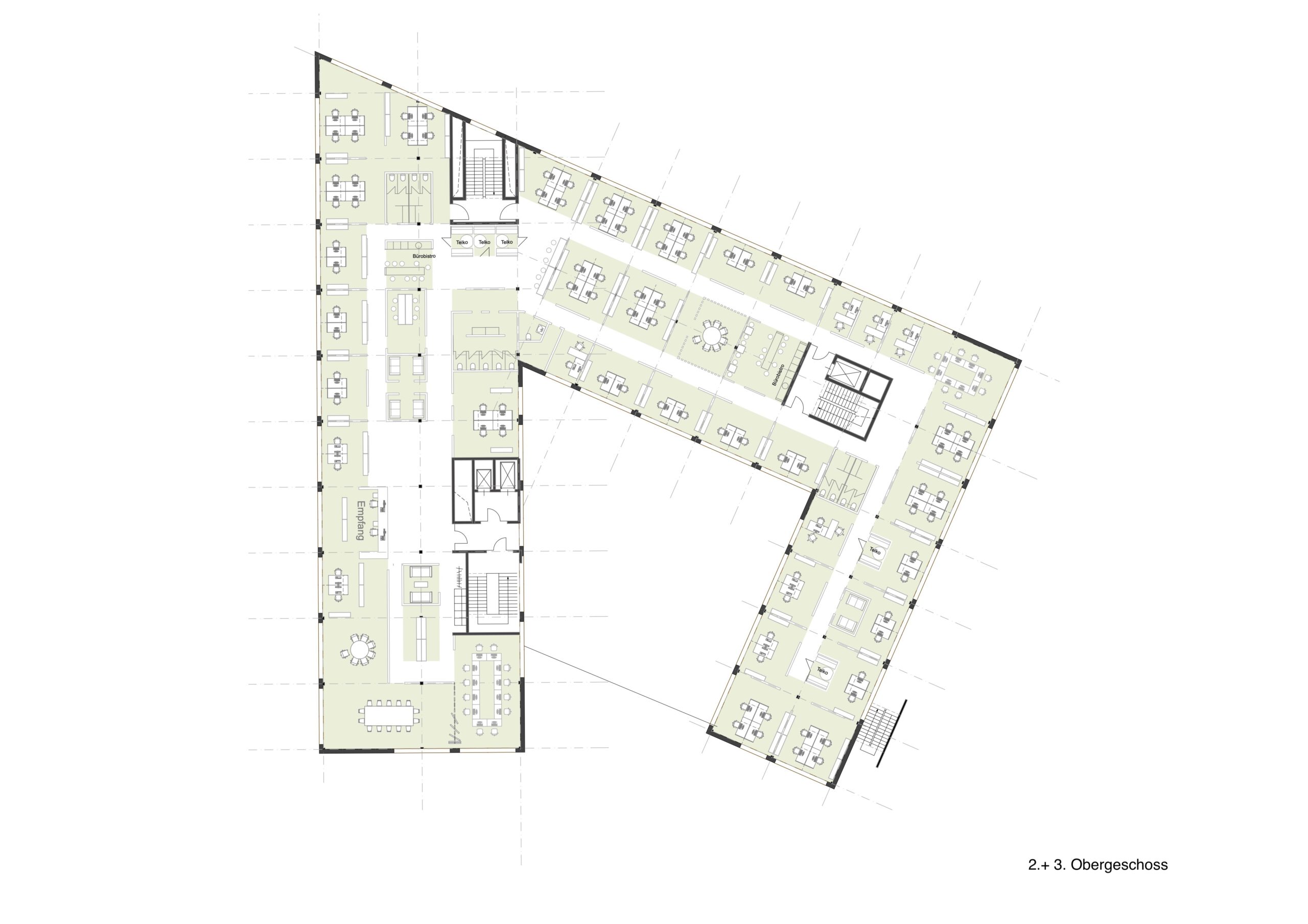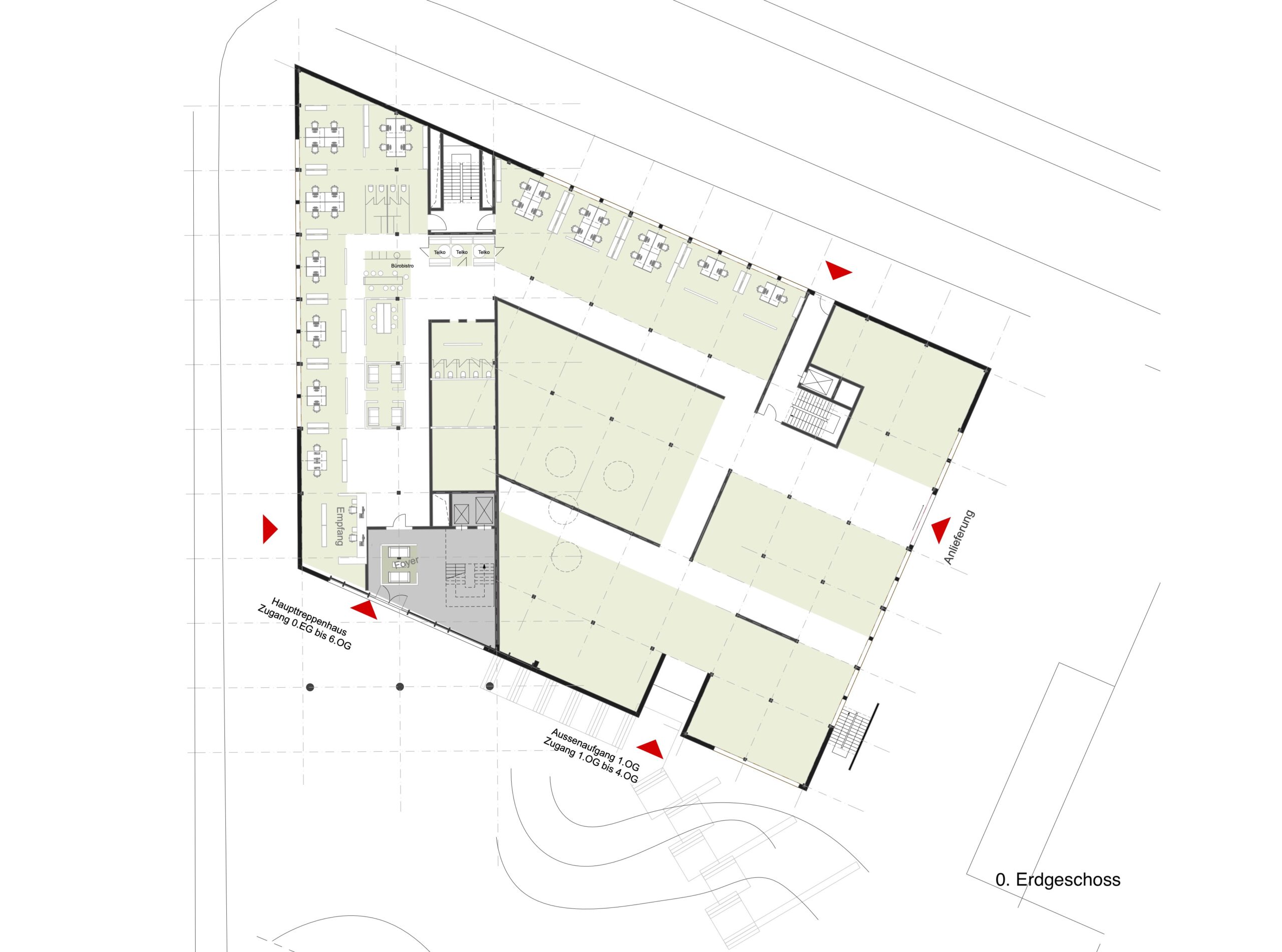 Das Gebäude reagiert mit seiner Struktur auf den sich immer wieder ändernden Bedarf. Ein zentraler Treppenraum, mit angegliederten Nebenräumen, bildet den Kern des Bürohauses. Um diesen Kern bilden sich Nutzungseinheiten unterschiedlicher Größe, die über einen Nebenflur an das Treppenhaus angeschlossen sind. Bei größeren Einheiten kann auf den Nebenflur verzichtet werden. Das zwei / dreigeschossige Eingangsfoyer bildet den kommunikativen Mittelpunkt des Gebäudes.